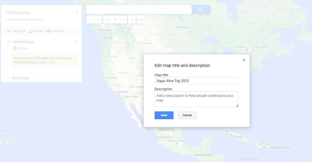 4. I like to use each layer as a different category – hotels, restaurants, wineries, excursions, etc. Select the 3 dots next to the “untitled layer” and rename it accordingly. You can add as many layers as you wish.