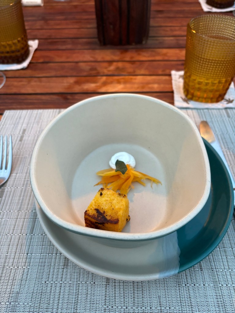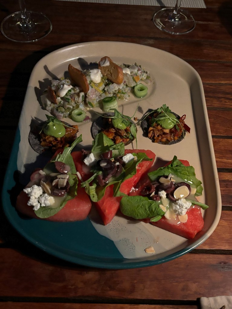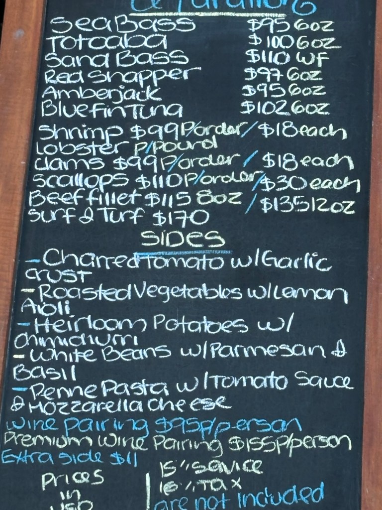 Food was very good. On our visit they were serving butternut squash soup with a large focaccia crouton, watermelon salad, octopus tostada, and sea bass tartar for the appetizer. All were phenomenal. I got the sea bass, which was very good, plus two shrimp on the side which were huge but also $18 A PIECE! My husband got the surf and turf and said the shrimp were the best he’s had in his life. My brother in law got the seared tuna, which was slightly spicy on the outside but cooked perfectly and super high quality.