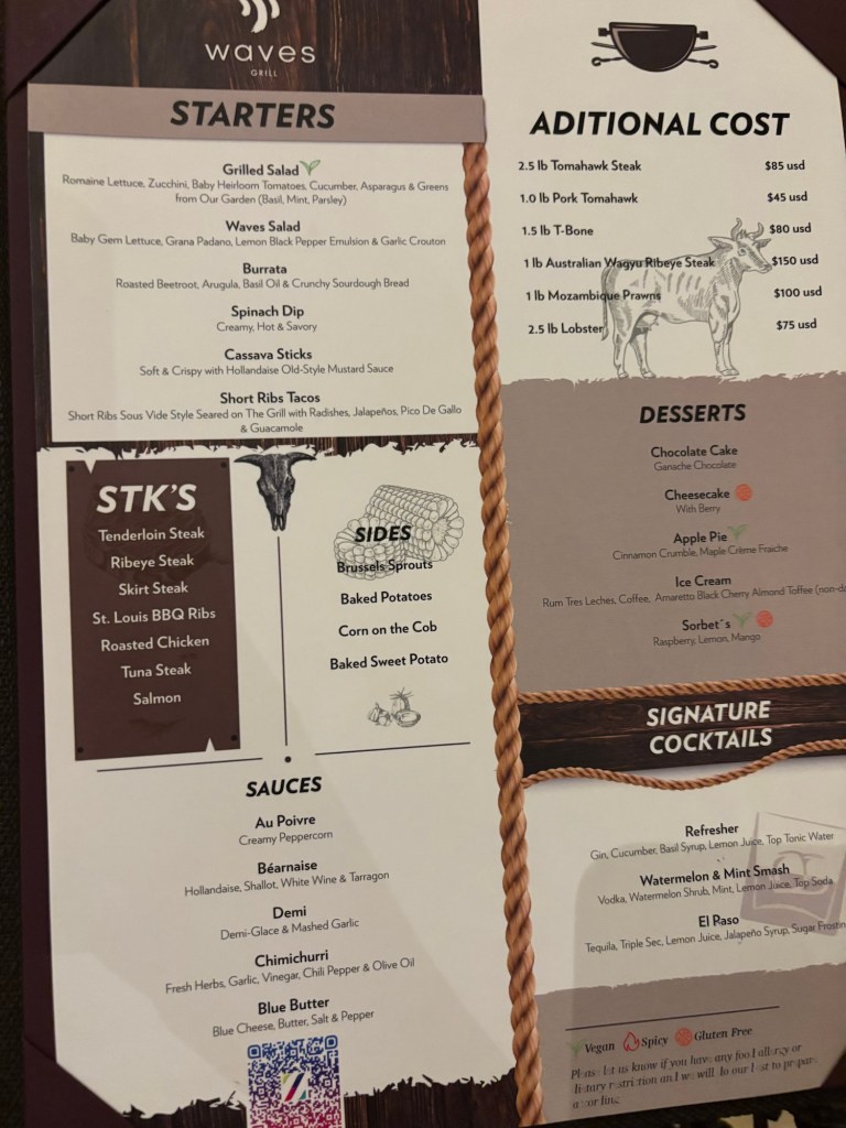 Waves – steakhouse at Zilara – tenderloin was shockingly good, baked sweet potato- yum, chicken looked overcooked but the boys said it had good flavor, Brussels were just ok